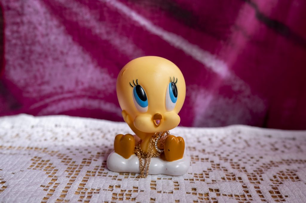 04/13/2021 Rome. Morena holds her gold necklaces on a toy of Tweety the canary.