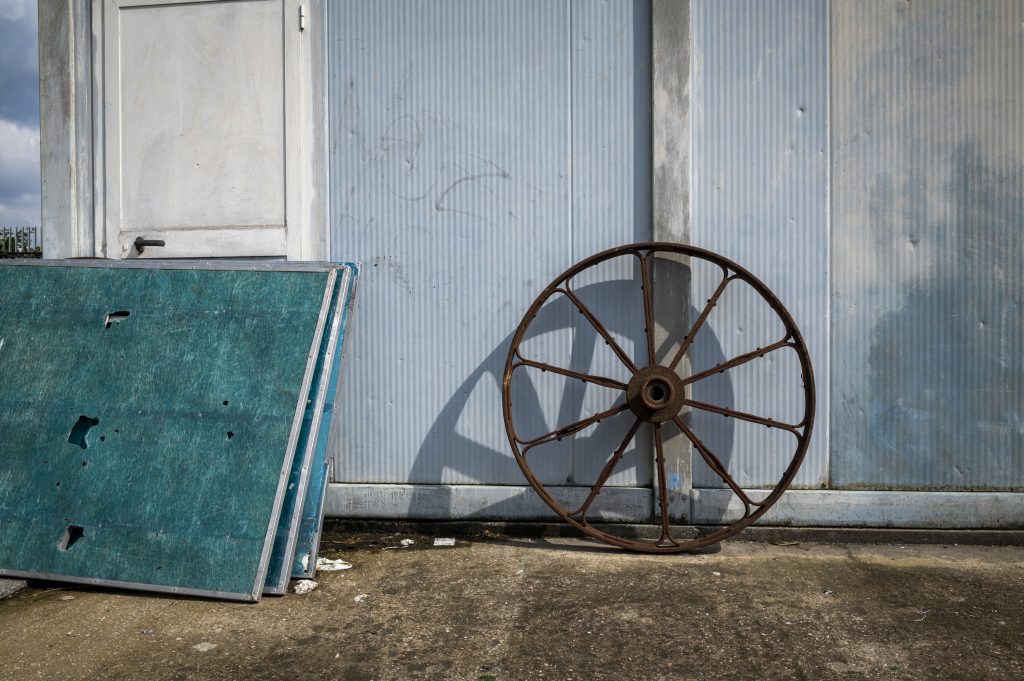 06/21/2021 Rome, Italy. Diego and the mountain of doors left over from countless cellars emptying. Posed portrait.